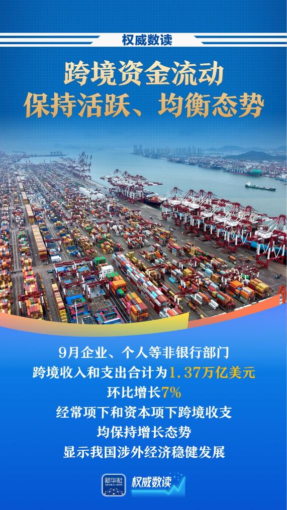 国家外汇管理局10月22日公布的数据显示,9月份企业和个人等非银行部门跨境收支总额1.37万亿美元,环比增长7%。经常项目和资本项目跨境收支均保持增长趋势,表明我国涉外经济稳定发展。前三季度,我国涉外收支达11.6万亿美元,创历史同期新高。